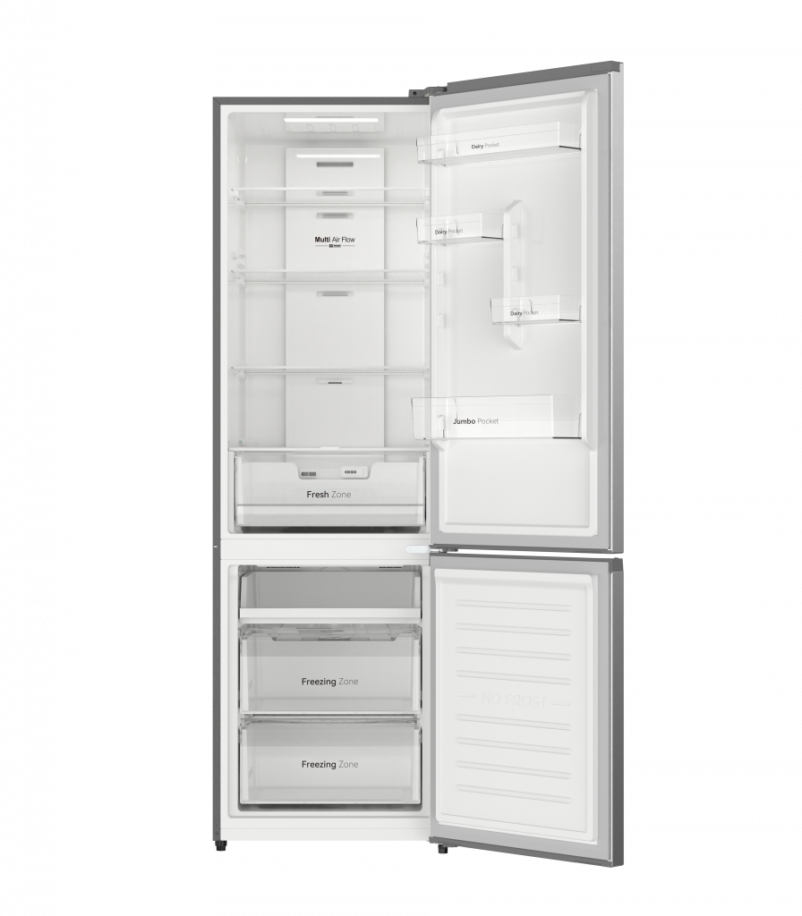 Refrigerador EVR-310NEI: Amplio y eficiente, con una capacidad total de 310 litros. Su diseño en acero inoxidable incluye puertas reversibles, tecnología Total No-Frost y sistema Multi-Air Flow. Equipado con un frigorífico de 215 litros y un congelador de 95 litros con tres cajones transparentes. Clasificación energética E para un consumo reducido.