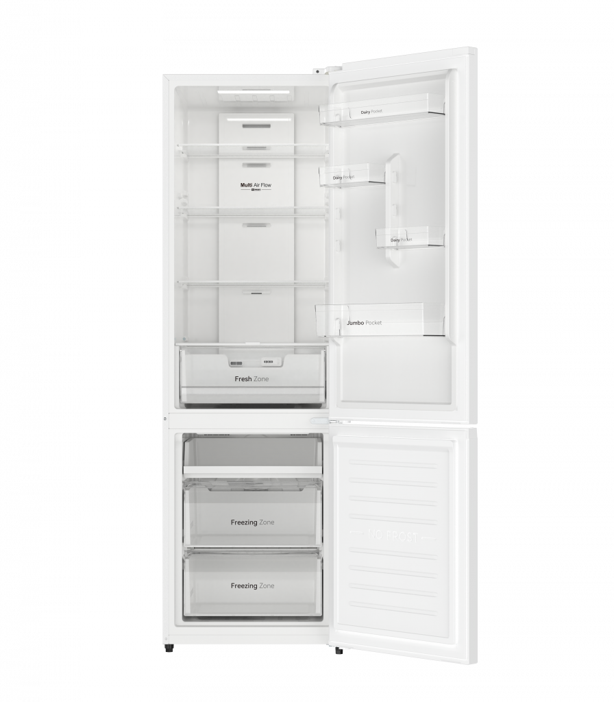 Refrigerador EVR-310NEW: Amplio y eficiente, con una capacidad total de 310 litros. Su diseño blanco elegante incluye puertas reversibles, tecnología Total No-Frost y sistema Multi-Air Flow. Equipado con un frigorífico de 215 litros y un congelador de 95 litros con tres cajones transparentes. Clasificación energética E para un consumo reducido.