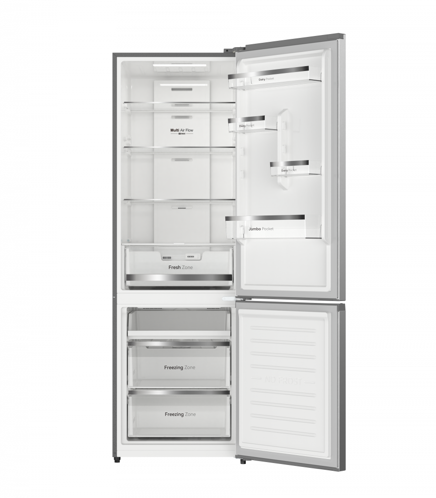 Frigorífico Combi EVR-405NEI: gran capacidad de 405 L con sistema Total No-Frost para una conservación eficiente y sin escarcha. Diseño en inox con con compresor Inverter, tecnología Multi-Air Flow, control electrónico, luz LED y bisagras ocultas. Clasificación energética E, funcionamiento silencioso (37 dB) y diseño práctico con puertas reversibles y apertura de 90°.