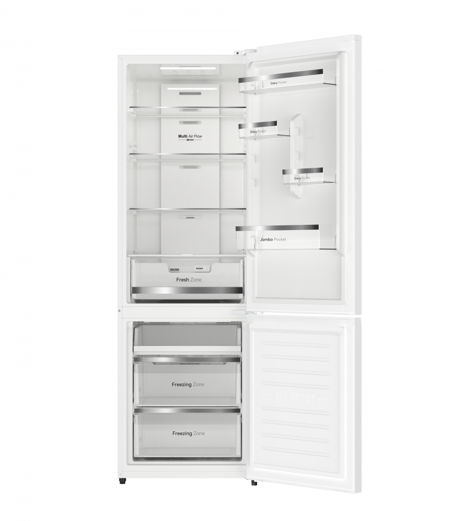 Frigorífico Combi EVR-405NEW: gran capacidad de 405 L con sistema Total No-Frost para una conservación eficiente y sin escarcha. Diseño en blanco con compresor Inverter, tecnología Multi-Air Flow, control electrónico, luz LED y bisagras ocultas. Clasificación energética E, funcionamiento silencioso (37 dB) y diseño práctico con puertas reversibles y apertura de 90°.